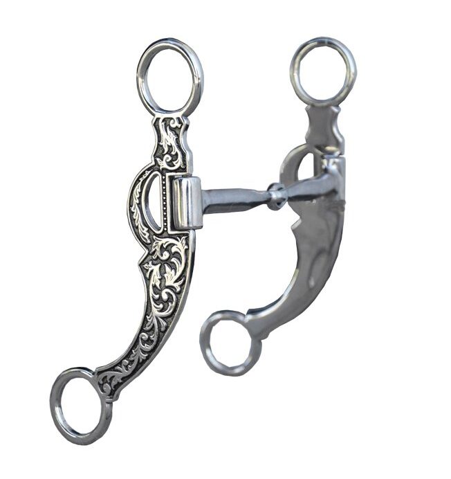 Kankikuolain yhdellä nivellä Snaffle Bit with Shanks Floral 12,7 cm, suukappale kupariupotuksin, leveys 5″/noin 12,7 cm, paksuus noin 1,1 cm, kauniit vipuvarret, joissa hopeanvärinen kukkakaiverrus mustalla pohjalla, vipuvarren koko pituus noin 18 cm.