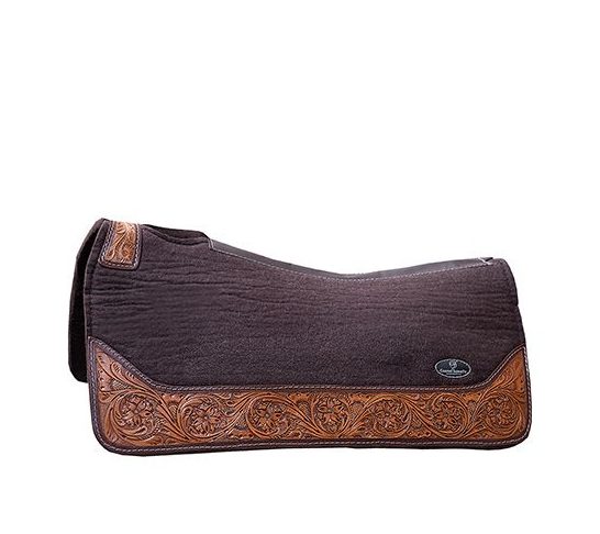 CSF Supreme Woolen Feltpad Tooled, upea satulahuopa kauniilla koristelluilla nahkareunoilla, anatomisesti muotoiltu, valmistettu pehmeästä ja hienosta villasta, paksuus noin 1″ / 2,5 cm, koko noin 32″ x 33″ / noin 80 x 82 cm, väri tummanruskea.