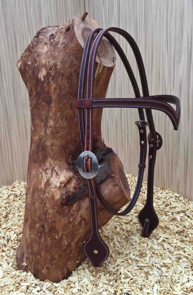 Sadesa leather V-brow headstall. With soft calf leather lining, doubled and stitched. With grain/baby basket tooling. Stainless steel hardware. With chicago screw connection.