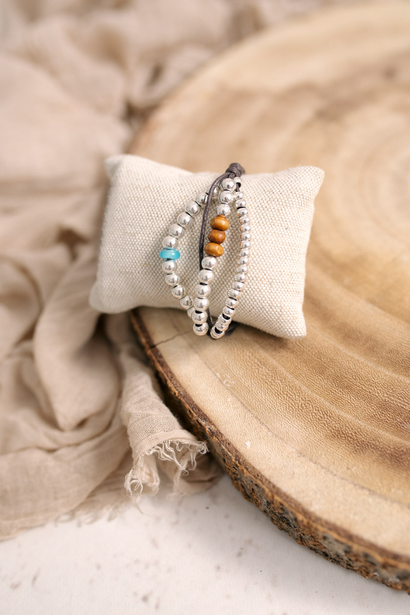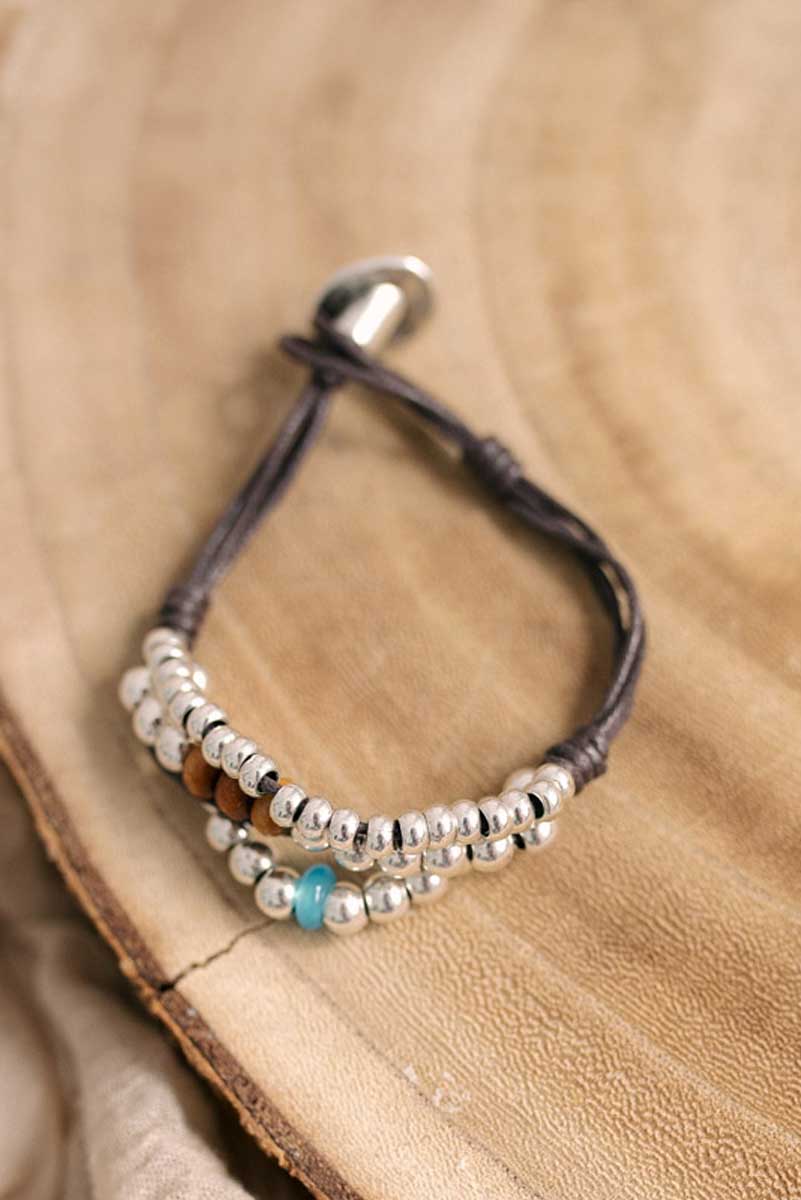 Zamak bead bracelet (an alloy of zinc with aluminum, magnesium, and copper), wood, and turquoise ceramic paste beads with a button closure. One size bracelet (approx. 19 cm). Perfect for everyday use. Zamak jewelry doesn’t require any special care. It can be soaked and washed with soap and water. It’s important to dry it thoroughly with a cotton cloth afterward to preserve the finish and prevent deterioration. Afterward, it’s recommended to store it in a cool place, inside a cotton bag.