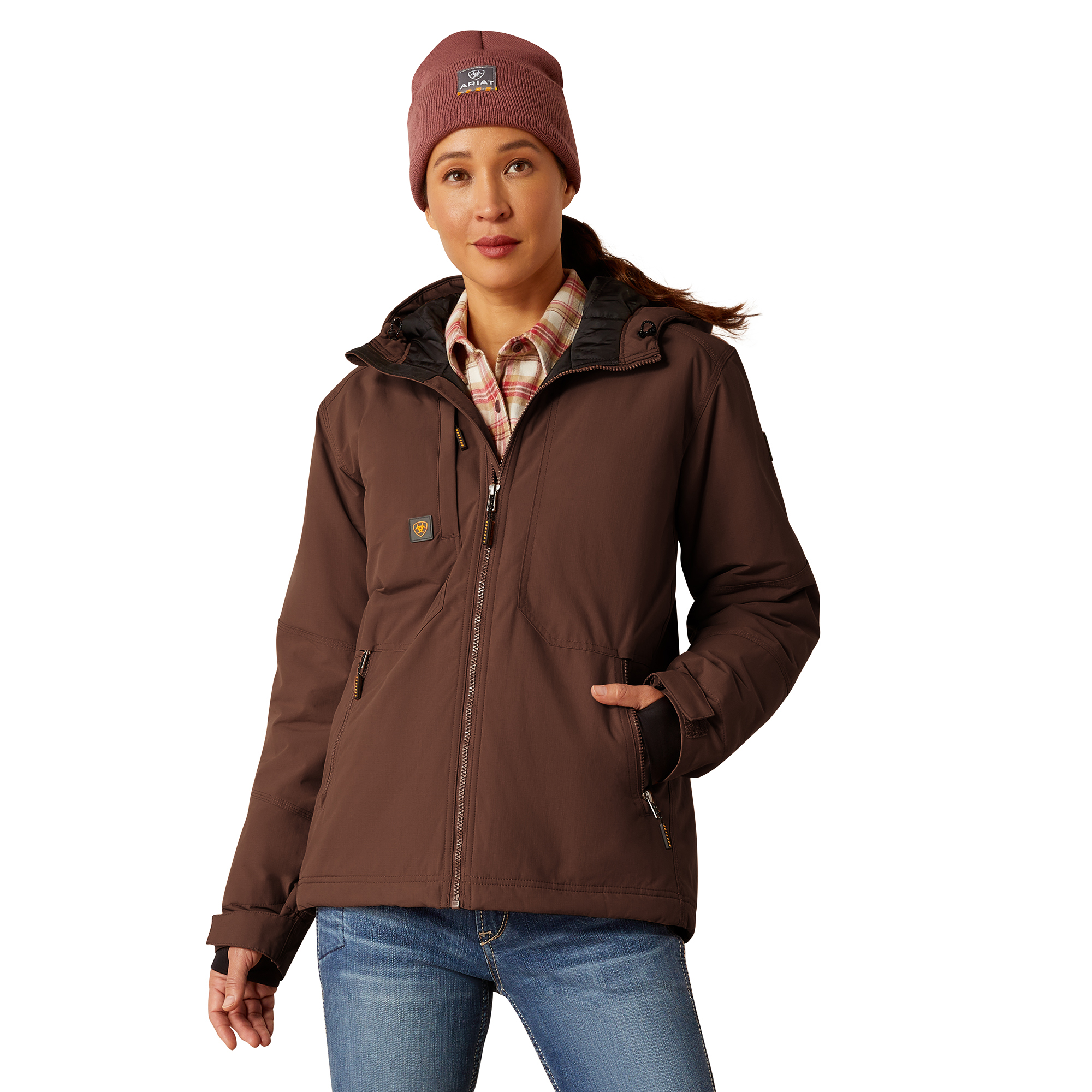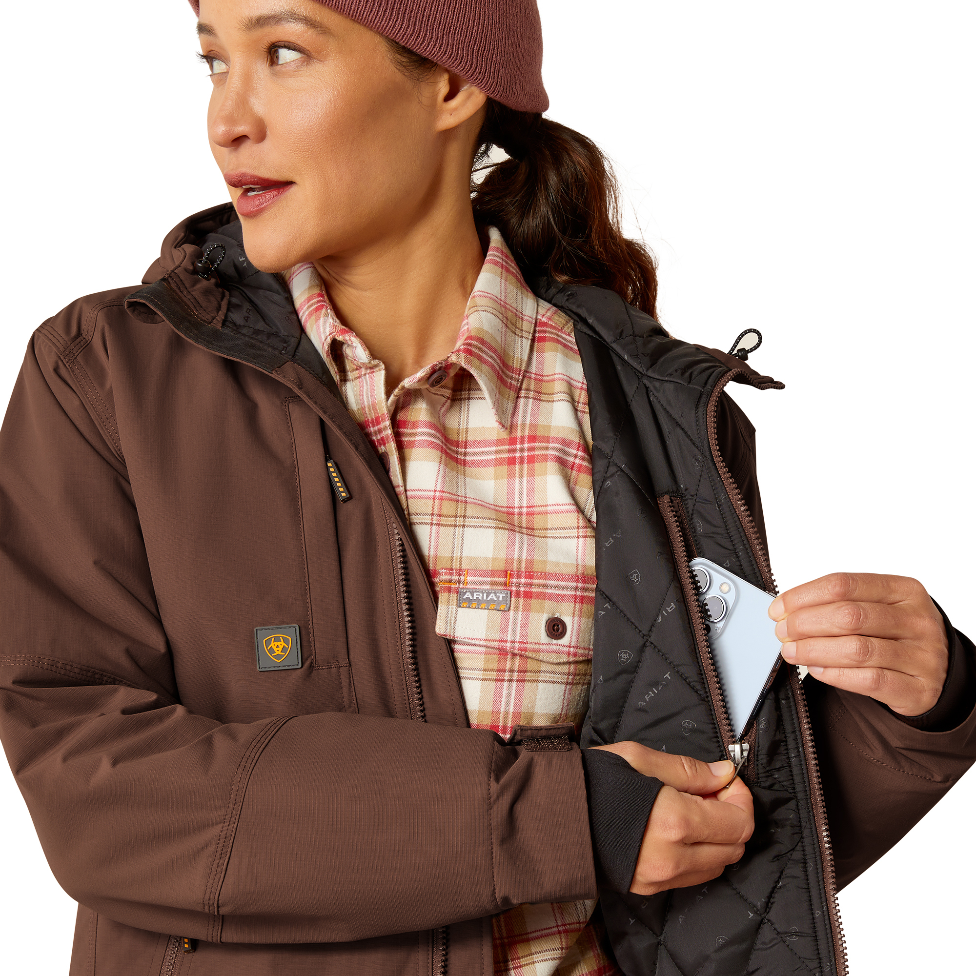 Ariat Women’s Rebar Cordura Ripstop Insulated Jacket takki, naisten kevyt, kestävä, mukava ja tyylikäs takki työhön ja vapaa-aikaan. Materiaali 100 % Cordura® Nylonia. Innovatiivinen 4 unssin CORDURA® ripstop -kangas on todella kestävää ja tarjoaa vertaansa vailla olevan suojan repeytymistä ja hankausta vastaan. 180g Cool Climate eristys pitää sinut lämpimänä kylmässä säässä. Takissa on tikattu vuori, muotoiltu huppu, etutaskut ja sisätasku, vettähylkivä pinta. Väri Aztec, lämmin punaruskea. Loistava takki syksyn ja talven vaihteleviin säihin!