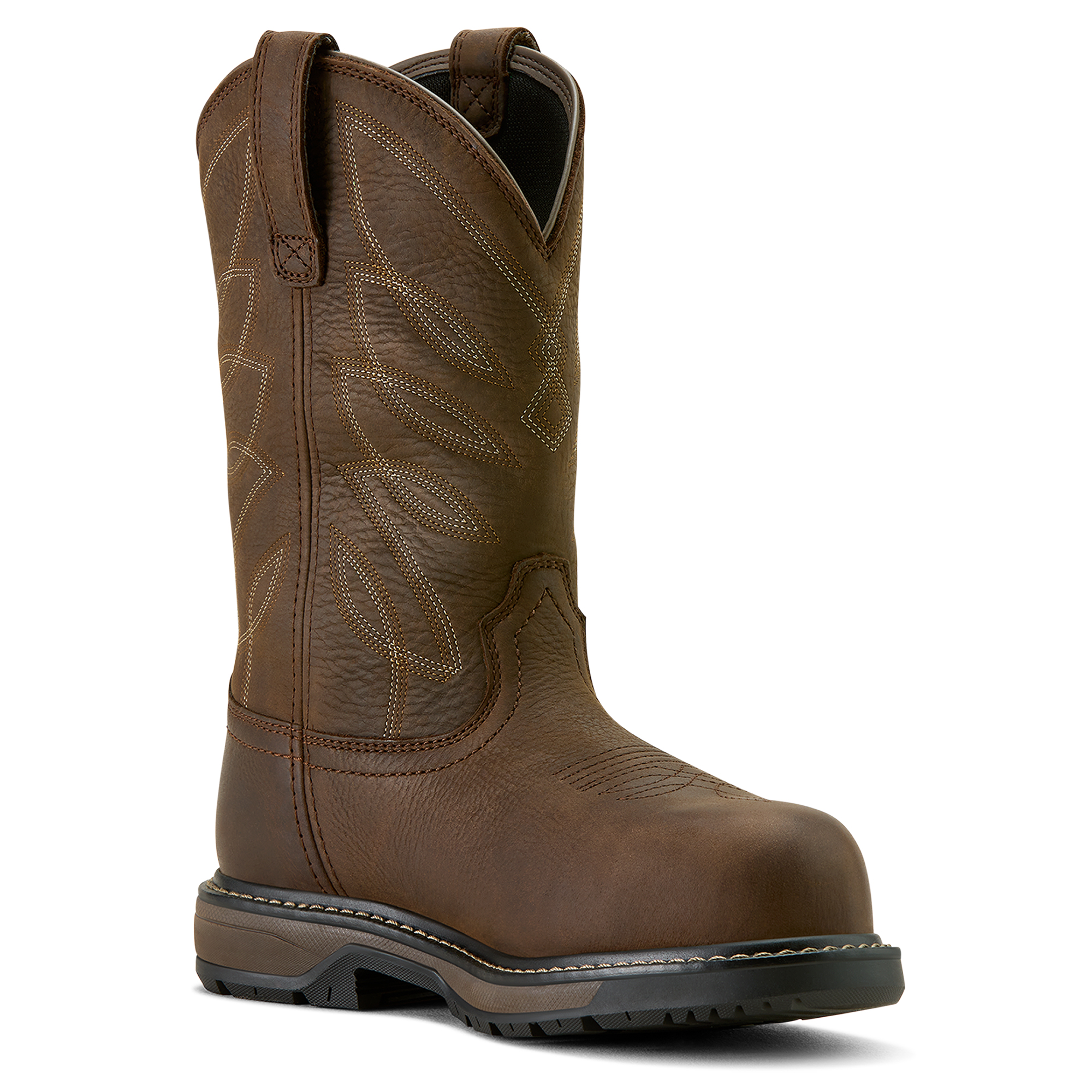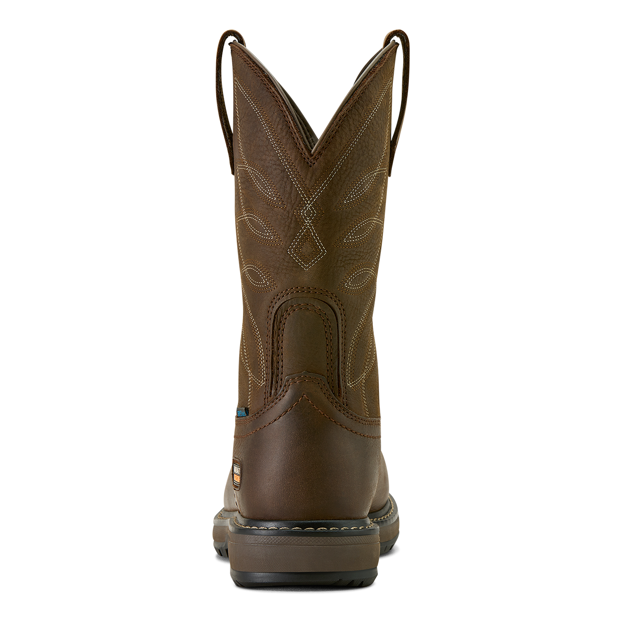 Ariat Women’s Work Boot Riveter Pull-On H2O Composite Toe, naisten turvakärjelliset työbootsit. Näissä bootseissa on ATS®-teknologia, joka tarjoaa ergonomista tukea epätasaisessa maastossa, DRYShield™-vedenpitävä ja hengittävä rakenne, irrotettava ja pehmustettu pohjallinen sekä kevyt ja joustava FLX Foam™ -välipohja, joka pehmentää jokaista askelta. Lisäksi öljyä ja liukastumista estävä Duratread™-pohja tarjoaa maksimaalisen kulutuskestävyyden. Uusi U-Turn®-teknologia mahdollistaa helpon bootsien jalkaan vetämisen. Pyöreä turvakärki on komposiittia, joka suojaa tehokkaasti olematta kuitenkaan painava. Bootsien materiaali on nahkaa, vuori 50%kierrätettyä polyesteria. Varren korkeus 10″/noin 25 cm, kannan korkeus 1,25″/noin 3 cm, leveys normaali/width B Medium. Väri Dark Brown/tummanruskea, varressa vaalea kuviointi. Nämä bootsit sopivat erinomaisesti talli-ja ulkotöihin!