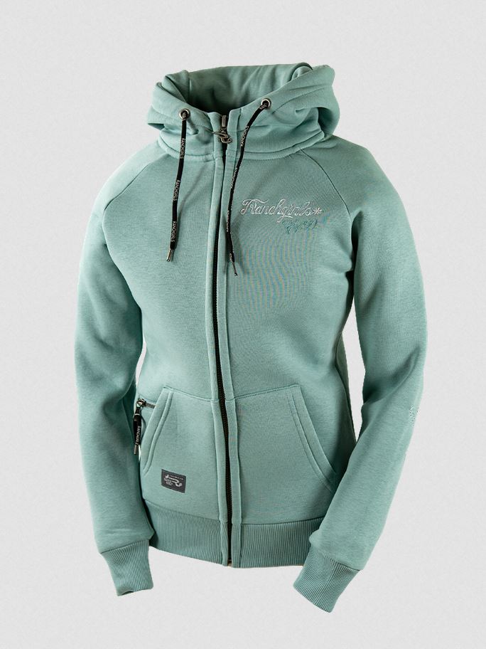 Ranchgirls Hooded Sweatshirt ’SHILOH’ has a unique design, consisting of glittering rhinestones and elaborate embroidery. Constantly new, incoming color combinations don’t let boredom arise. Our cozy sweatshirt fabric keeps you warm even on cold winter days. The women’s cut is pleasantly long and designed with freedom of movement. An extra zippered pocket, below the Kangoo Bag, ensures safe storage of small things. Our round hood shape nestles comfortably and warmly on the neck. A strong, wide metal zipper can be operated safely and smoothly. Elastic rib cuffs ensure support and comfort. The sizes are according to the respective size, EU 42 = US XL. There is enough space under the jacket for a long – sleeve or a light sweater. 70% organic cotton 30% polyester.