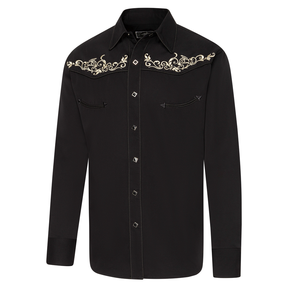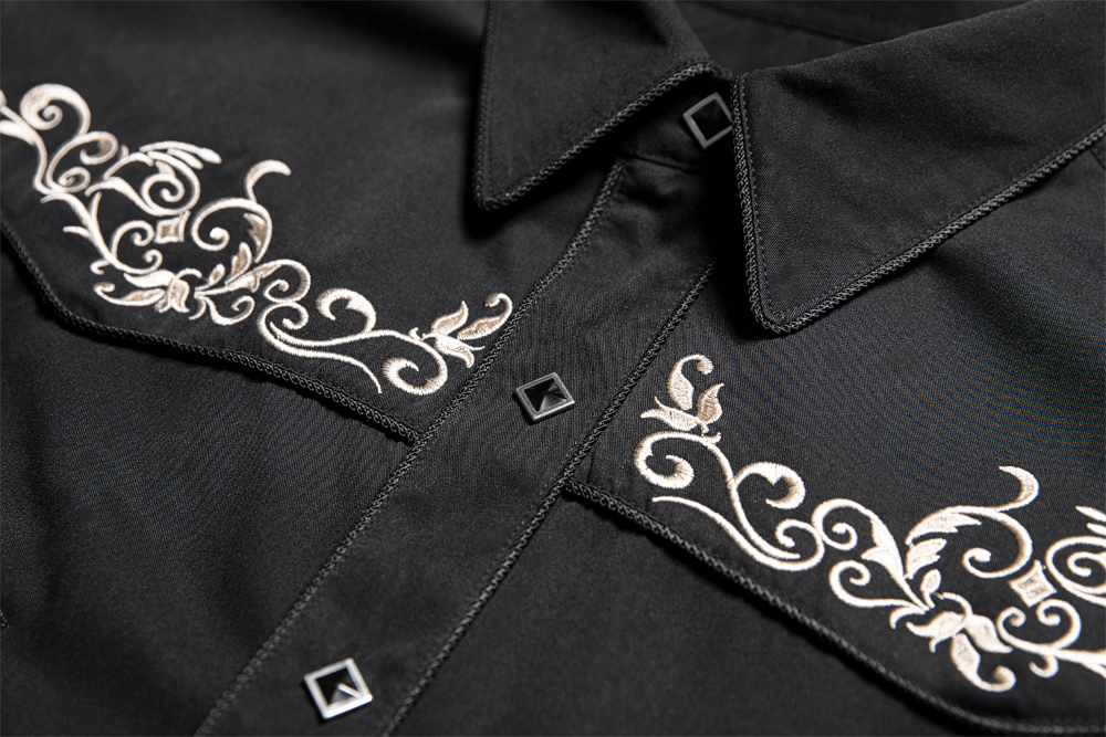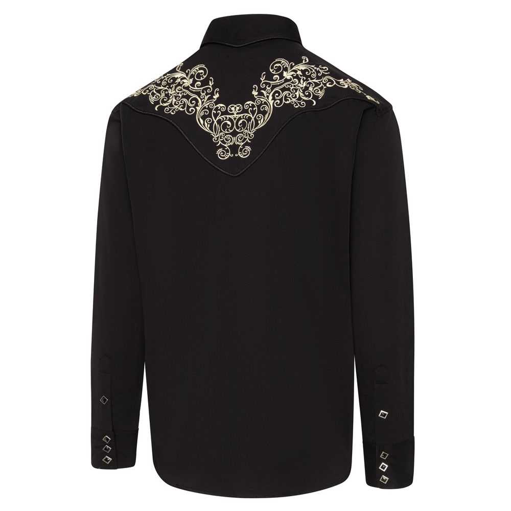 Exquisite black western shirt with western yoke. Magnificent embroidery on the chest and back. Harmoniously coordinated with cord piping. Material: 65% polyester – 35% viscose.