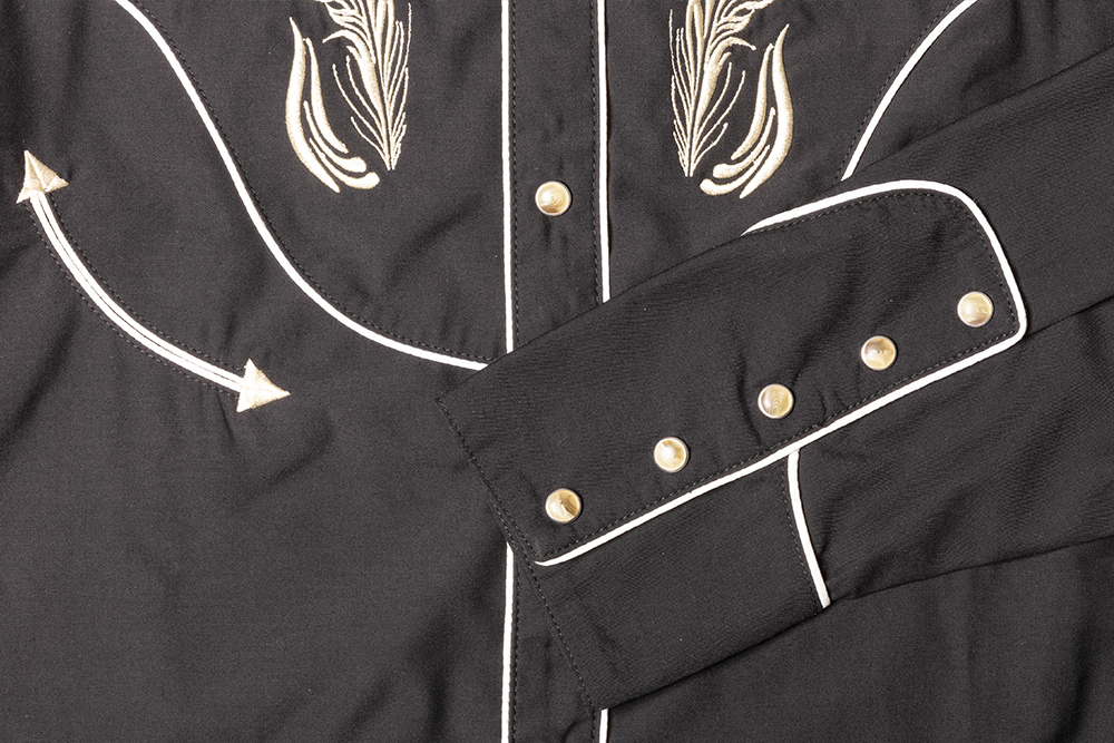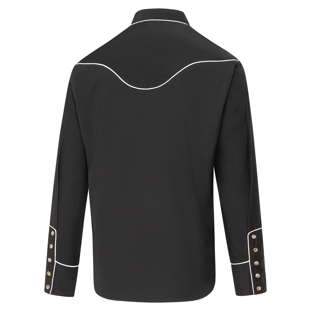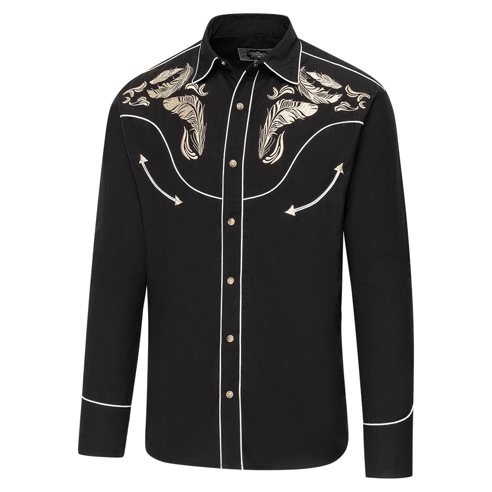 Exquisite western shirt with magnificent embroidery on the chest. Harmoniously coordinated with piping and high five-button cuffs. Material: 65% cotton – 35% viscose.