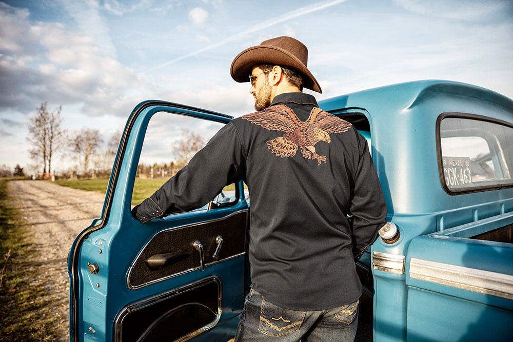 Stars & Stripes Westernpaita Men’s Floyd, miesten westernpaita, jossa hartioilla mokkanahkajäljitelmää. Selässä suuri, koristeellisesti kirjailtu kotka, jonka siivet on kirjailtu olkapäiden yli eteen. Smiley-taskut, nepparinapit ja kuusinappiset hihansuut tekevät tästä elegantista lännenpaidasta todellisen katseenvangitsijan. Materiaali 65% polyesteria/35% viskoosia. Väri musta.