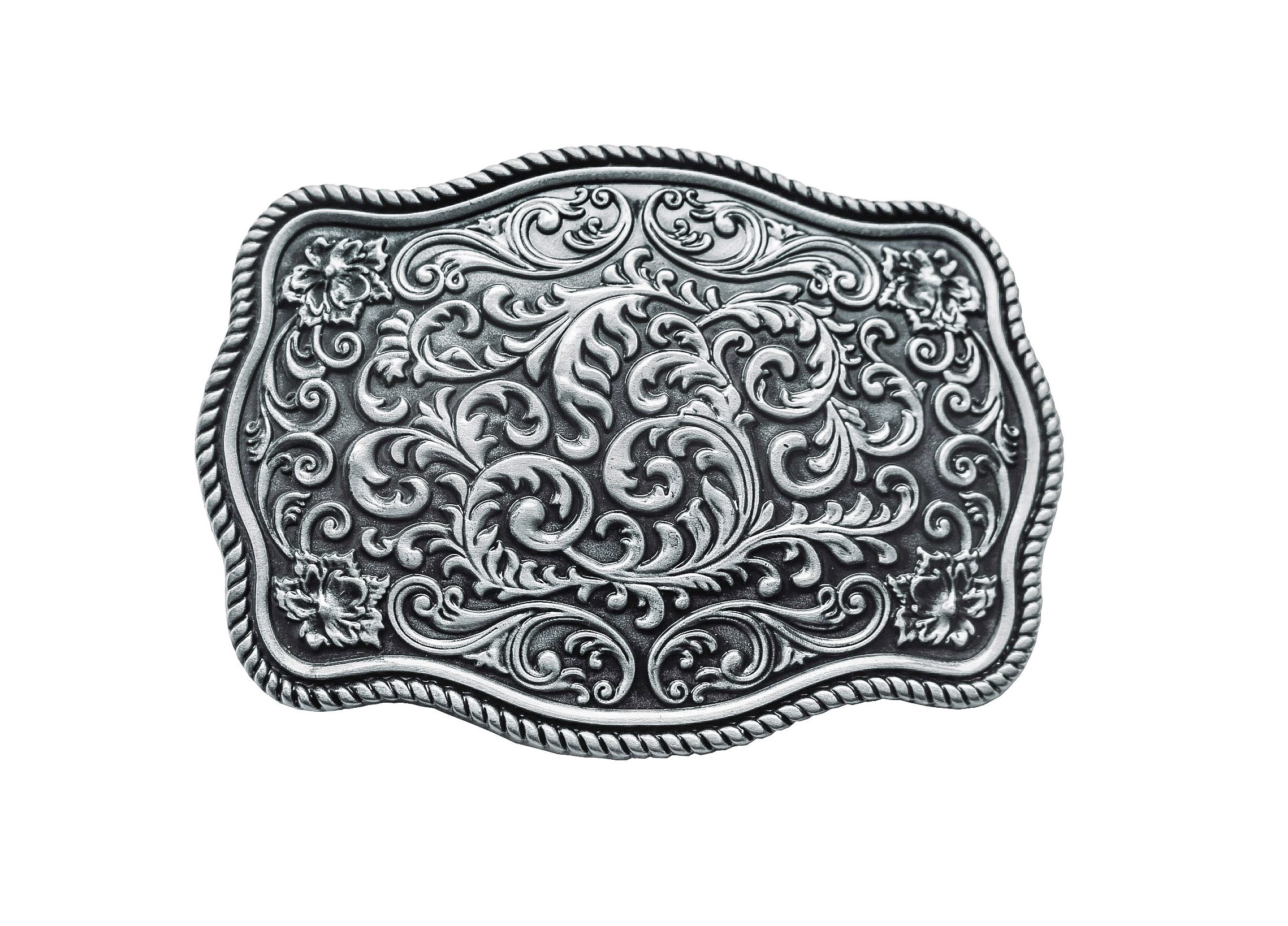 Western belt buckle with beautiful floral ornaments and blackened background. Material: 100% zinc alloy.