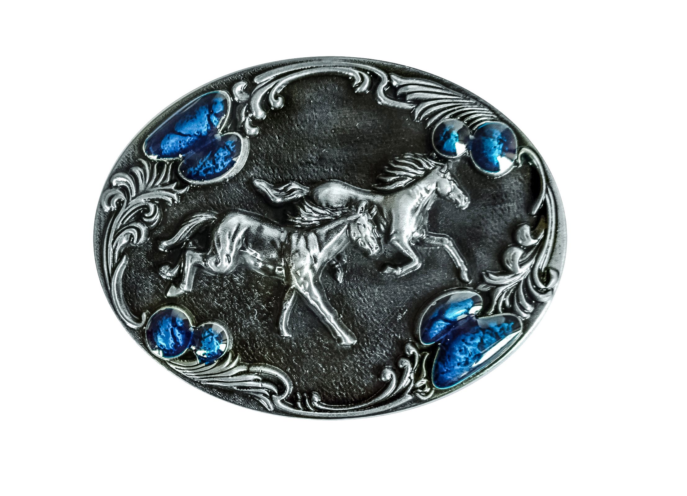 Vyönsolki Horses, kaunis tummanharmaa vyönsolki, jossa kaksi laukkaavaa hevosta, koristeena siniset emalikivet. Koko noin 9 x 7 cm.